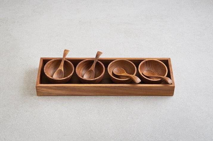 11in length 3.25in wide 1.25 height Bowls: 2.25in diameter x 1in height